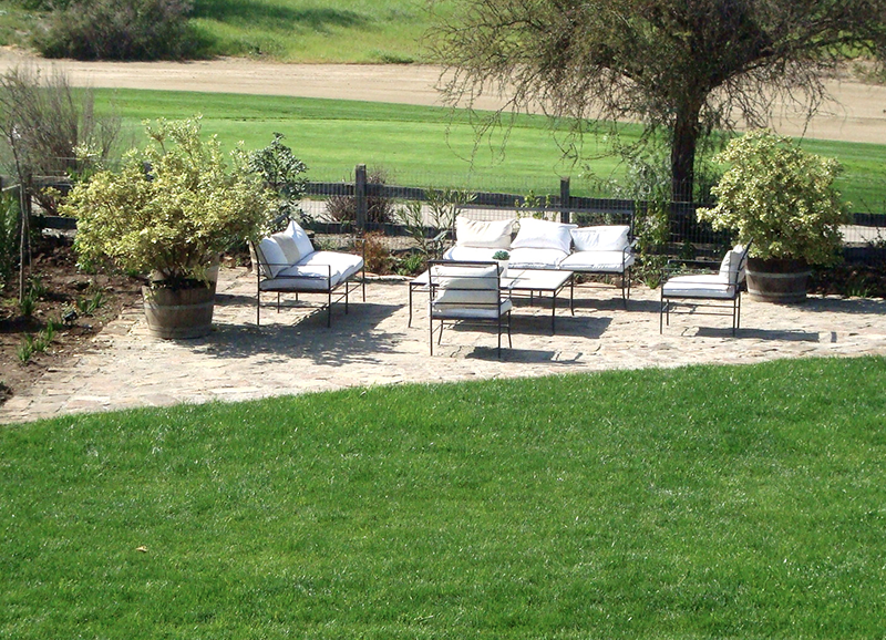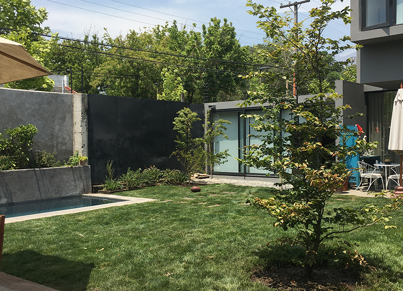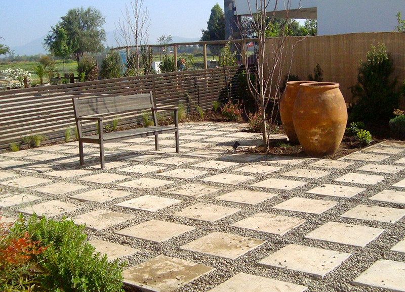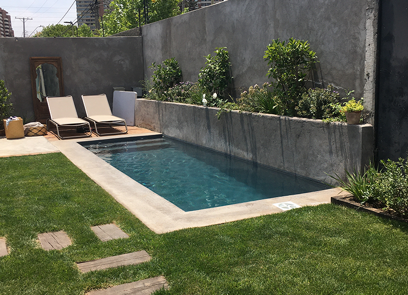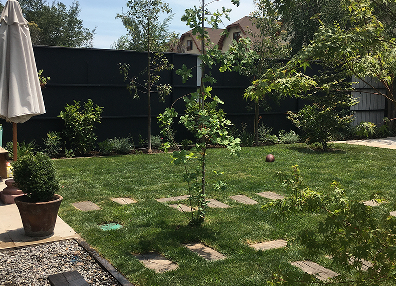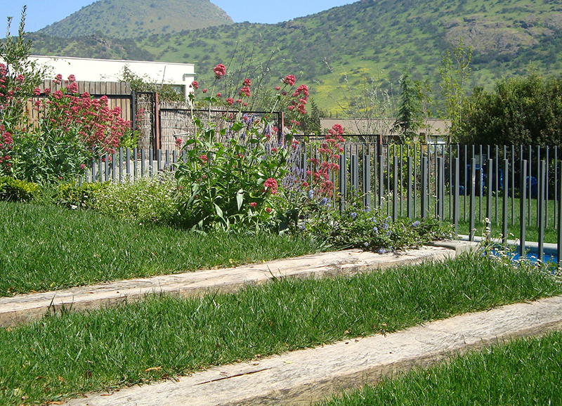 Los dueños de casa de este jardín querían un lugar con árboles grandes que le dieran sombra y estructura en un futuro. Se creo en el fondo un lugar de estar con un encino como protagonista, donde se proyecta la parrilla y sector comedor exterior. Se trabajo con una circulación de durmientes para marcar los recorridos a este sector y a la piscina.