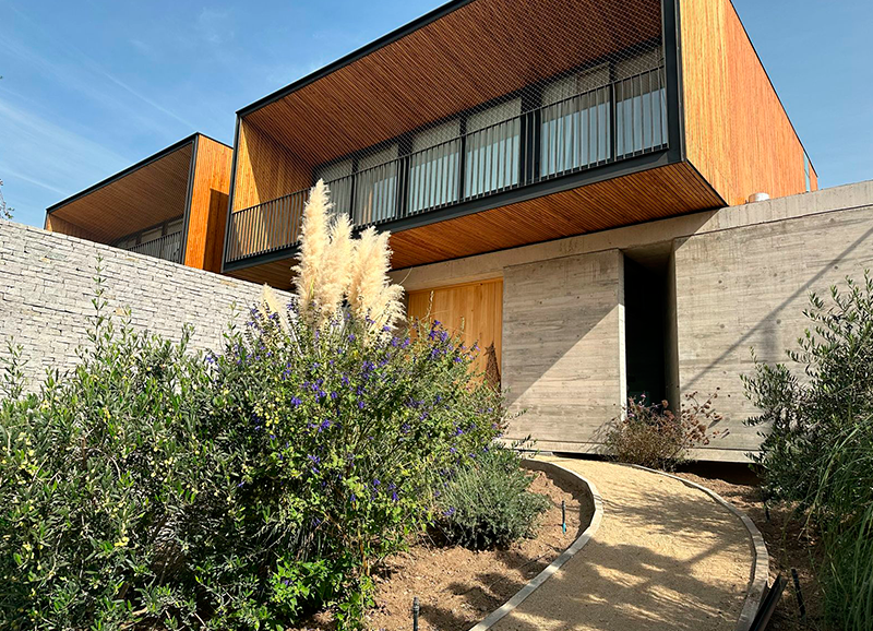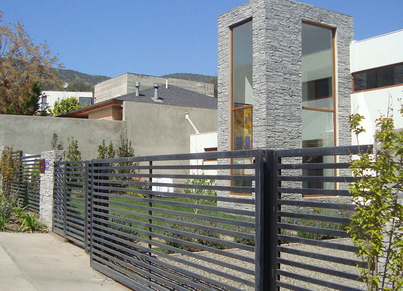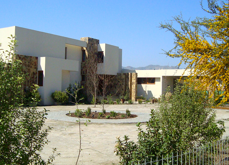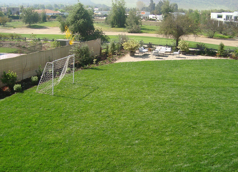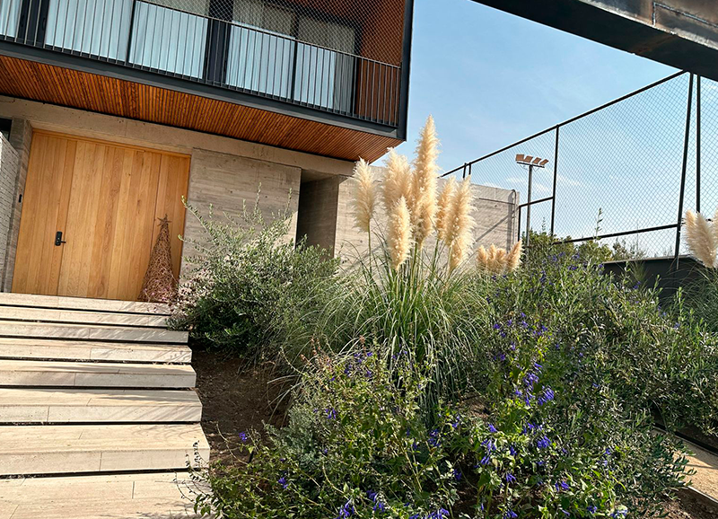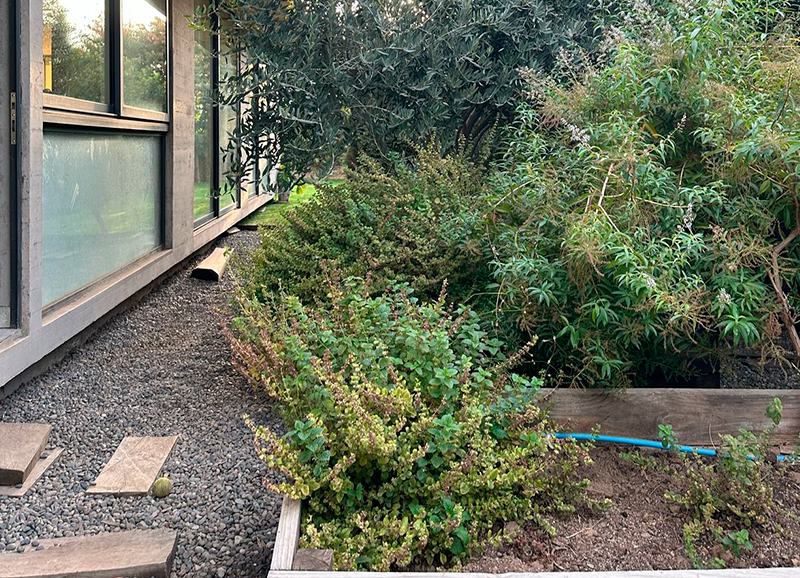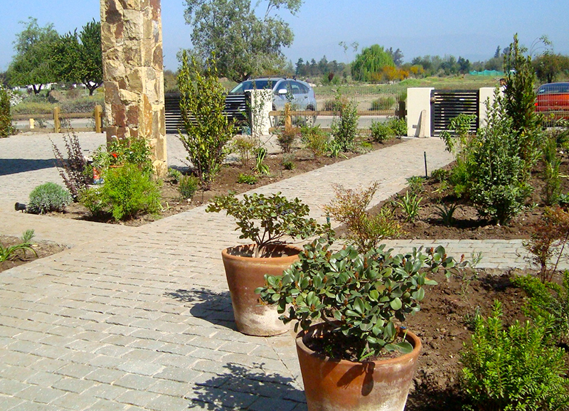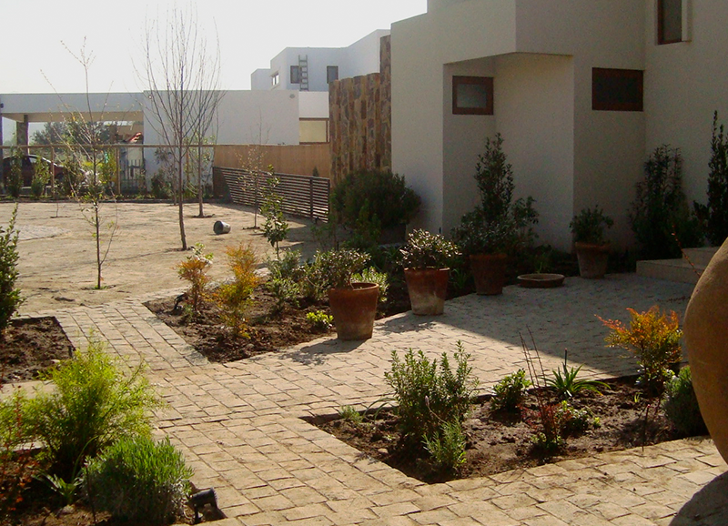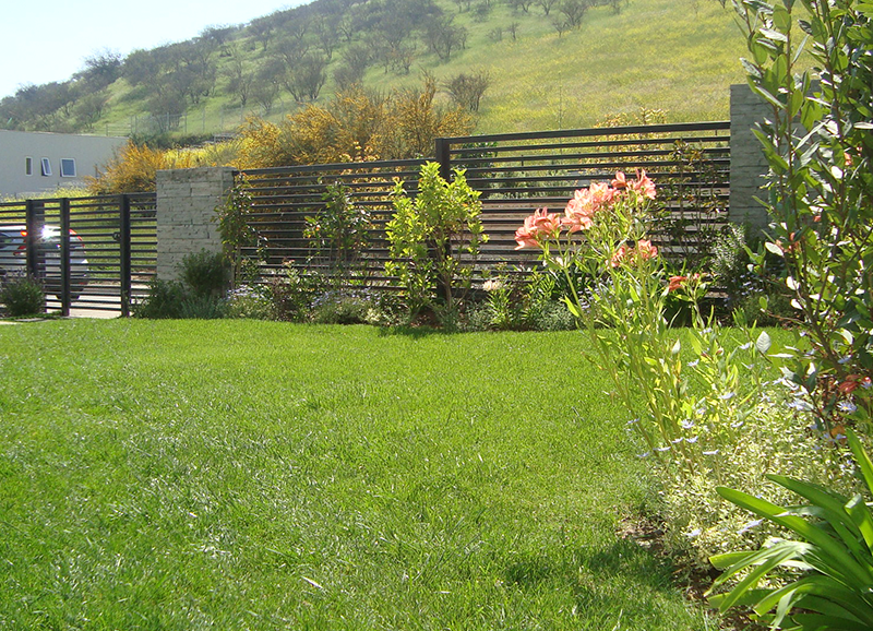 Este proyecto de casa residencial con hijos chicos, consistió en resolver dos espacios, uno de orientación norte con las vistas principales de la casa, y otro de orientación sur muy sombrío, a la salida de la salita de estar y cocina. Ambos espacios conectados por un quincho abierto por los dos lados, lo que permite conciliar las actividades que están pasando en las dos áreas. El primero se trabajo con un borde vegetal con distintos tipos de follajes y coloridos, y se creo además una huerta baja para los niños. Se mantuvo un gran quillay protagonista del jardín, y un espino en el sector de la huerta. En la otra área se creo un borde de hormigón en obra alternando macetas y asientos en obra. En las macetas se plantaron brachichitos para tapar las vistas de la casa de atrás, y el borde con ficus repens para enverdecer con el tiempo el gran muro de hormigón. El acceso de esta casa se trabajo con especies estructurales, como olivos y colas de zorro, dándole un caracter muy mediterráneo a la entrada.