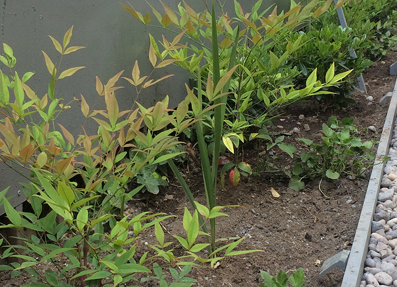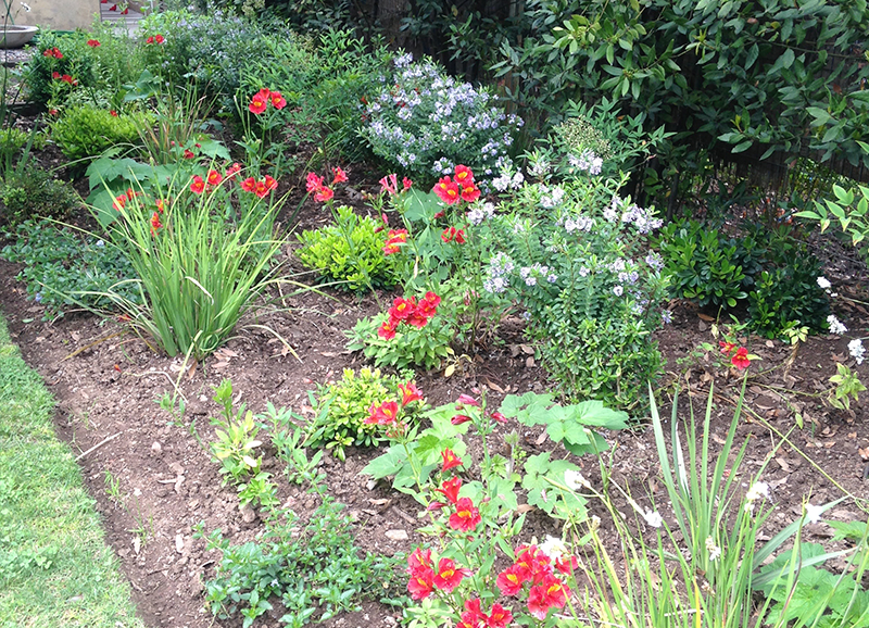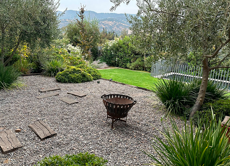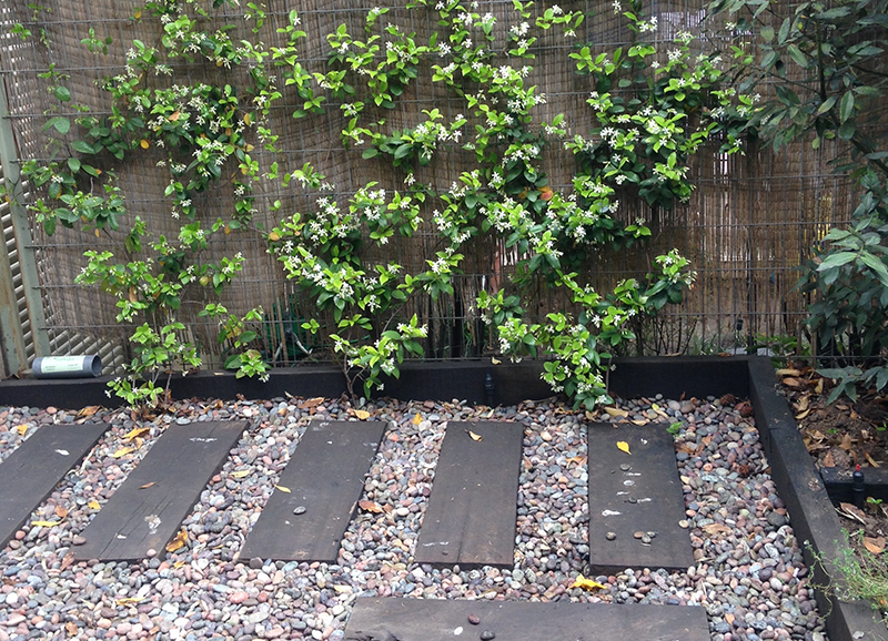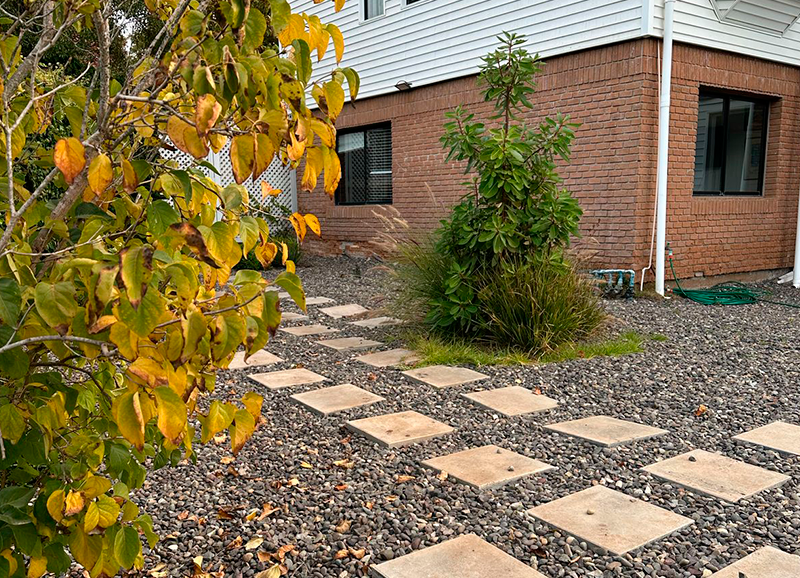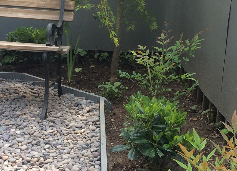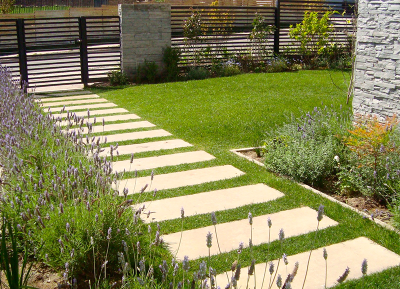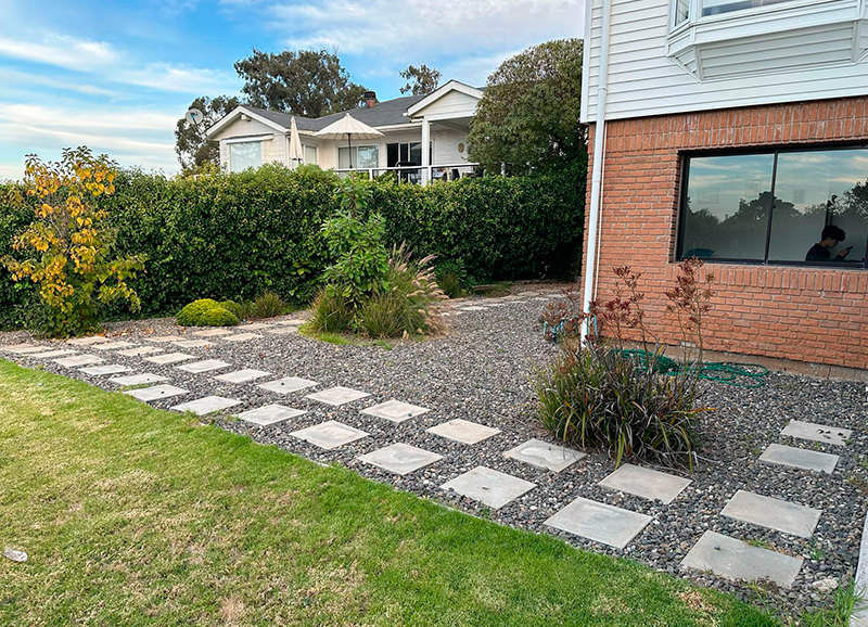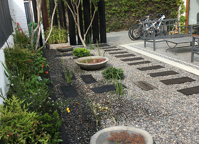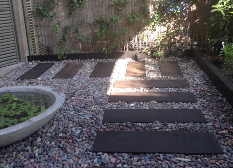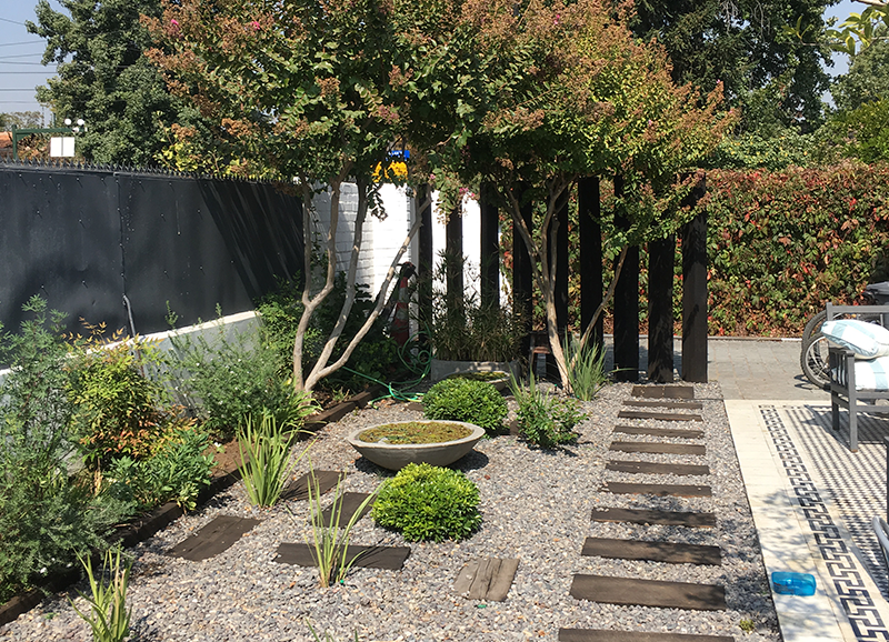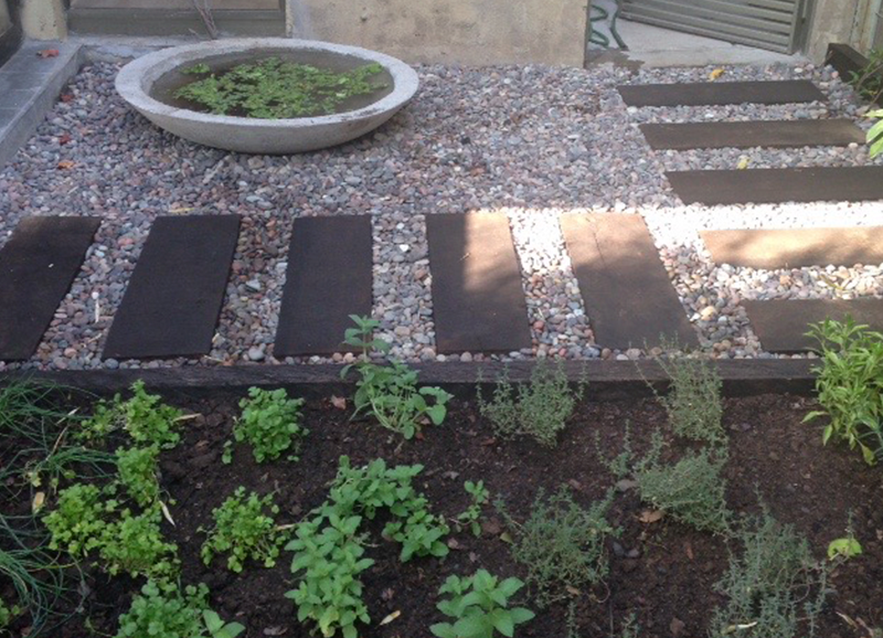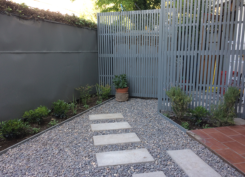 Una zona de entrada a la casa que era solo pasto, se transformó en un lindo trabajo de suelo con gravillas, huellas de durmiente impermeabilizados en negro, platones de agua de hormigón para plantas acuáticas y llamar a los pájaros, y un borde vegetal lleno de color y dinamismo durante el año. Todo esto fue enmarcado por un cortavista creado también con durmientes negros y un par de crespones existentes que fueron recuperados y realzados. Quedo un espacio muy lindo y acogedor como extensión de la salida de la cocina y del living – comedor.