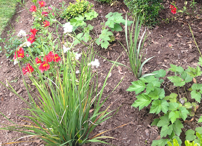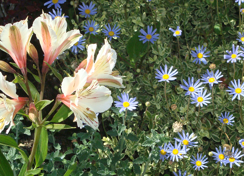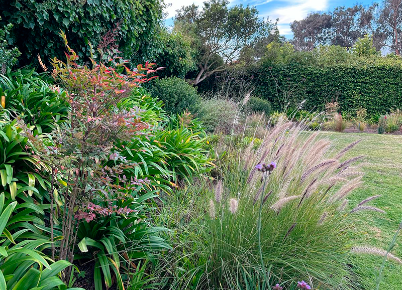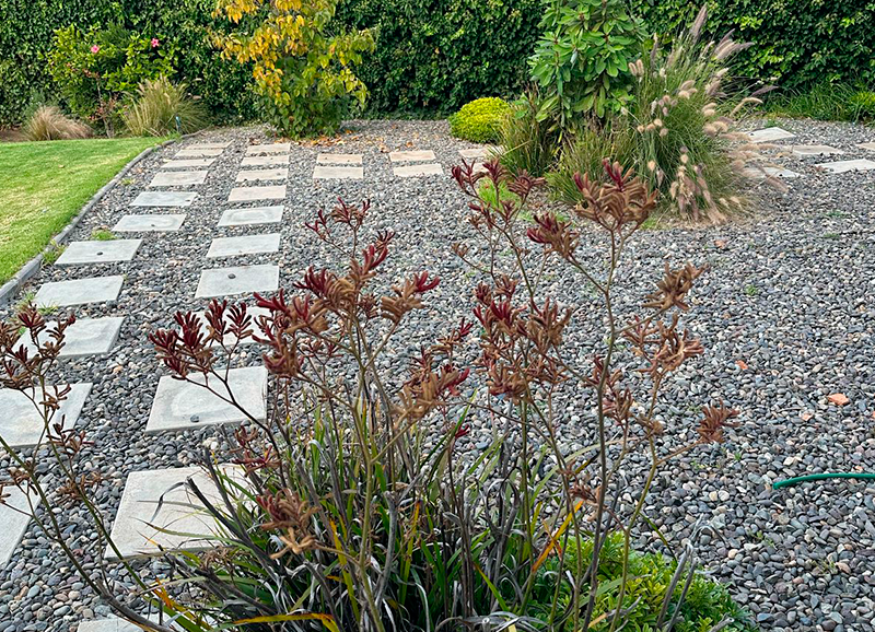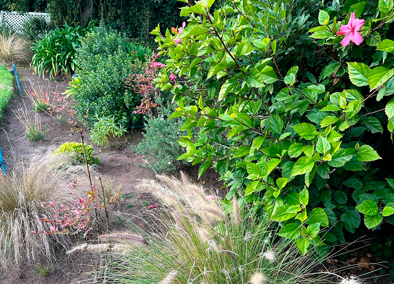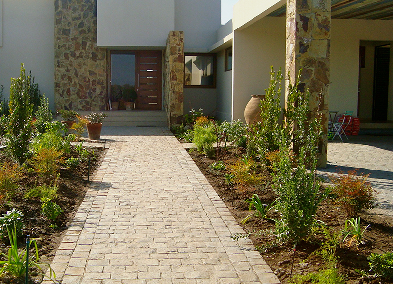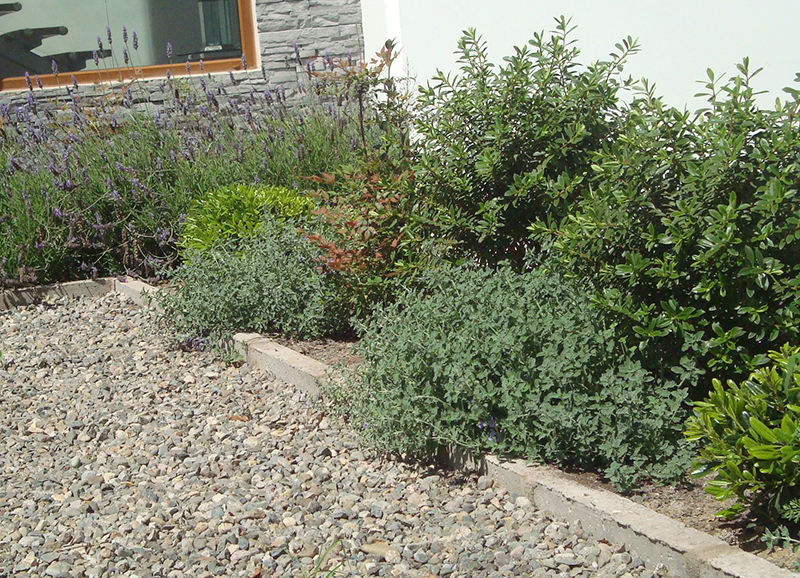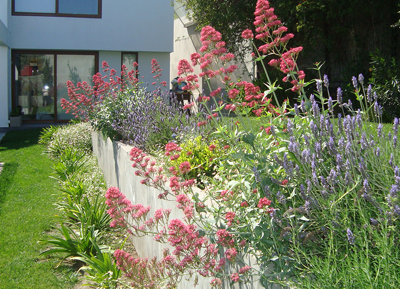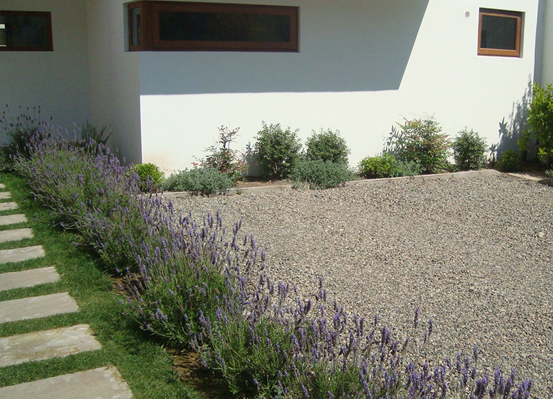 Este era un jardín ya establecido con mucho pasto y macizos de borde con arbustos y flores, principalmente agapantos. Se hizo una disminución importante del sector de pasto, reemplazándolo por un juego de suelo de gravilla gris, pastelones de hormigón y algunas plantas entremedio para dar movimiento y color. Los bordes vegetales se limpiaron y renovaron con la incorporación de mas especies para dar mas dinamismo y color, aprovechando el clima costero que permite tener flores todo el año.