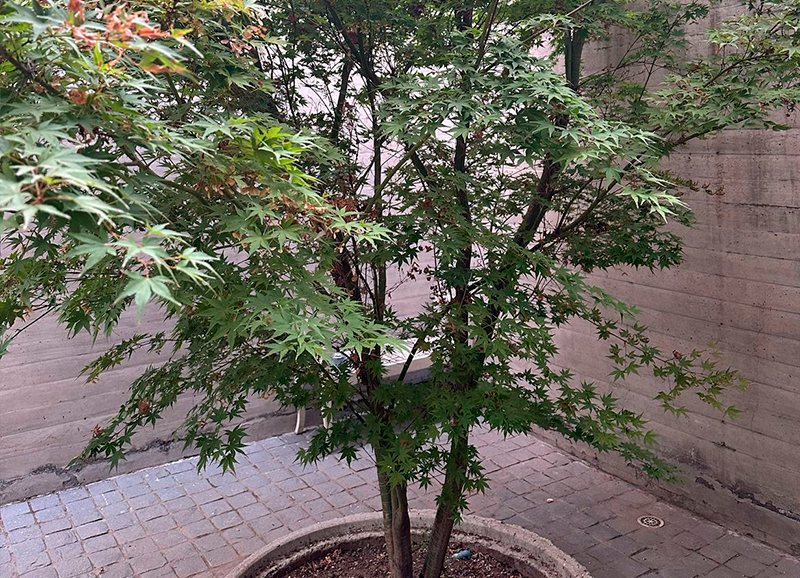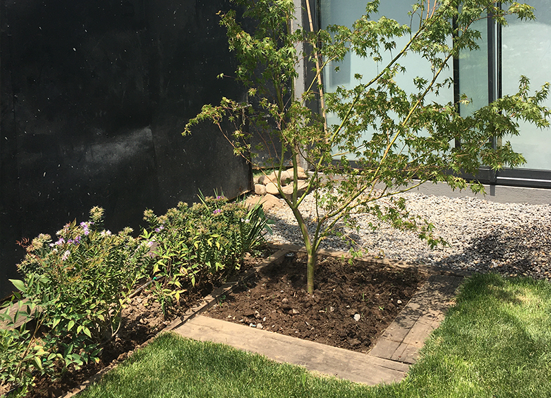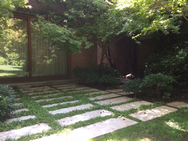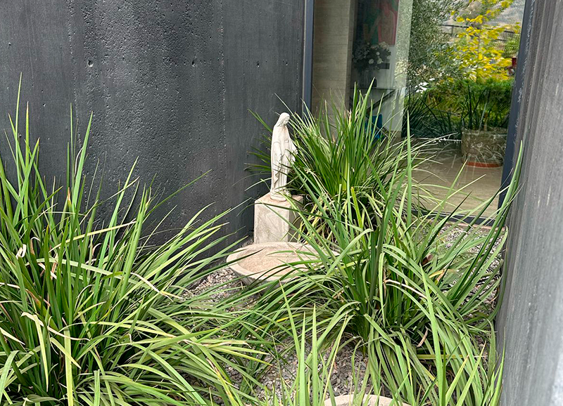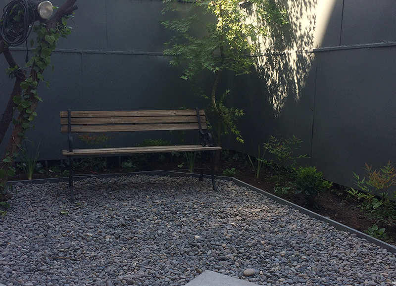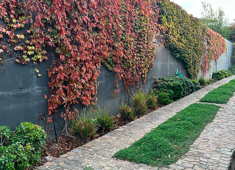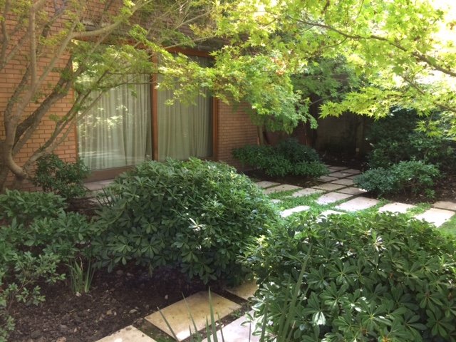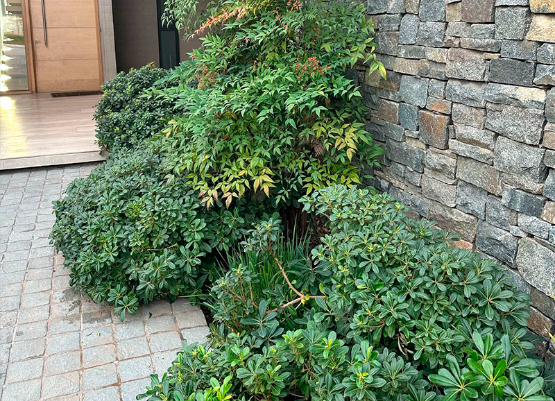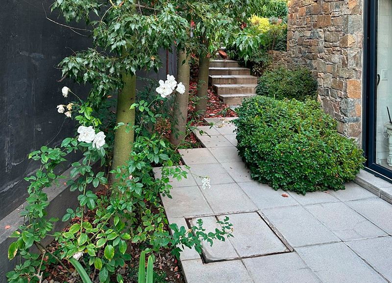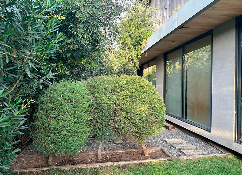 Este proyecto se recibió siendo un jardín muy antiguo y desgastado, que era solo pasto, varias coníferas grandes en los bordes, y algunos Acer japónicos a la salida de la pieza principal. Se hizo una limpieza de jardín y renovación de suelo, y se crearon jardineras y bordes vegetales renovados con especies de distintos coloridos. En la salida de la pieza principal se realzaron los Acer japonicos, creando un jardín de pastelones de gran formato con cotula entremedio y bordes con daphnes que dan aroma a finales de invierno.