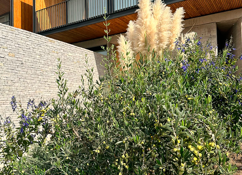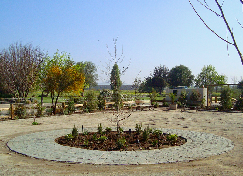 Dadas las condiciones de altas temperaturas y sequedad ambiental de este lugar, el trabajo en este jardín se enfocó en el uso de especies de bajo consumo hídrico y muy resistentes, y de crear un marco de vegetación que llevara las vistas hacia los cerros que rodean este lugar. La elección de especies también se basó en muchas plantas aromáticas con la intención de evitar el ataque de los conejos que abundan en los cerros del sector.