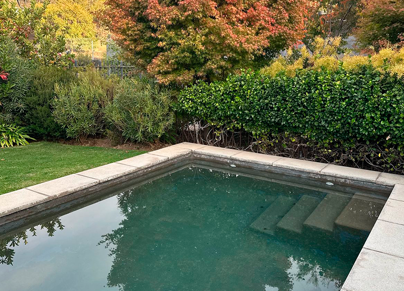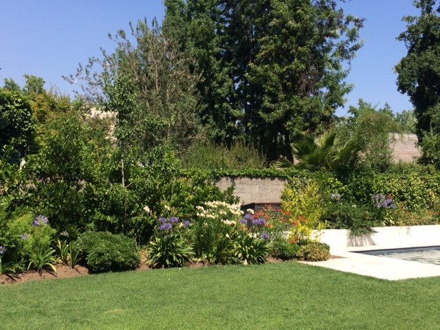 En esta casa familiar de tres niños, se dejo un área de pasto alrededor de la piscina y quincho, con bordes de jardineras con especies principalmente mediterráneas, y también se creo un sector con huertas a la salida de la cocina y salita de estar, para que los habitantes pudiesen cultivar hierbas y verduras a lo largo del ano. Se incorporo además un lindo Acer japónico en un jardín semi-interior, el que recibe al entrar a la casa.