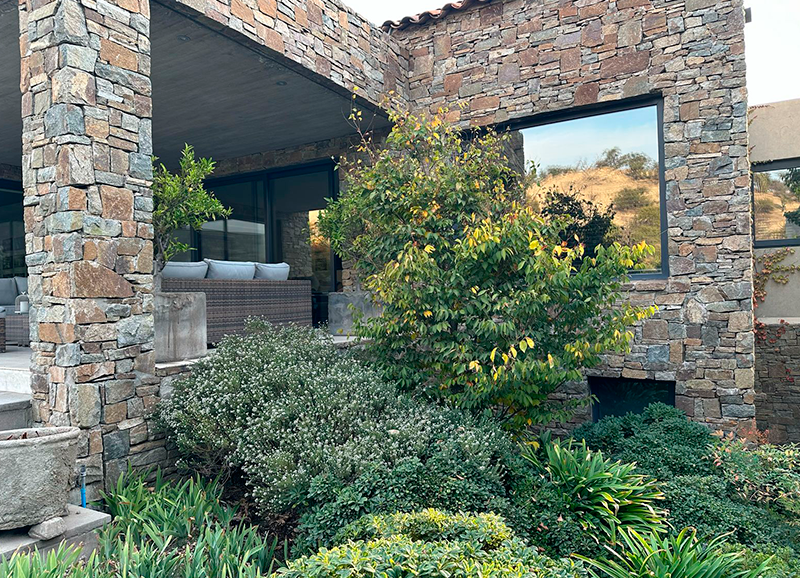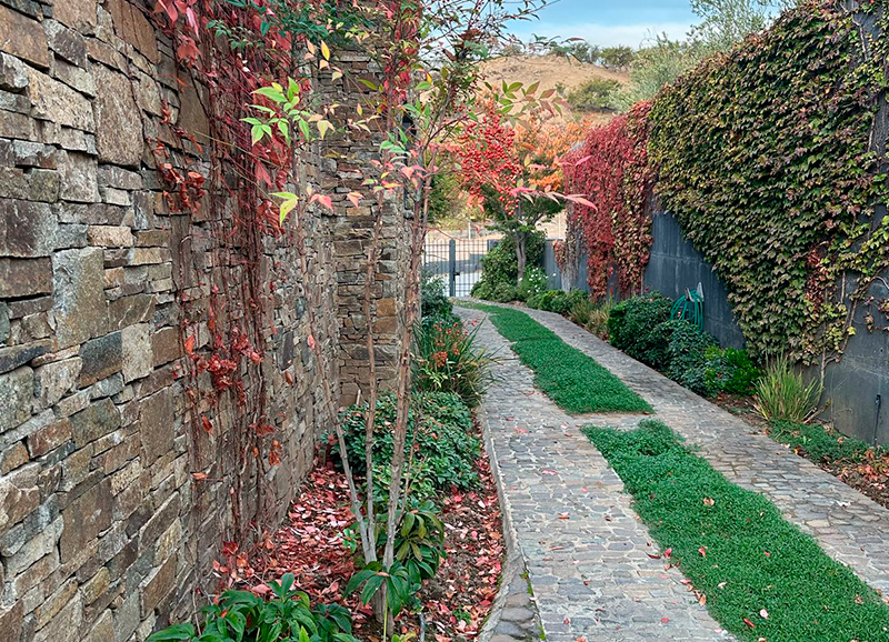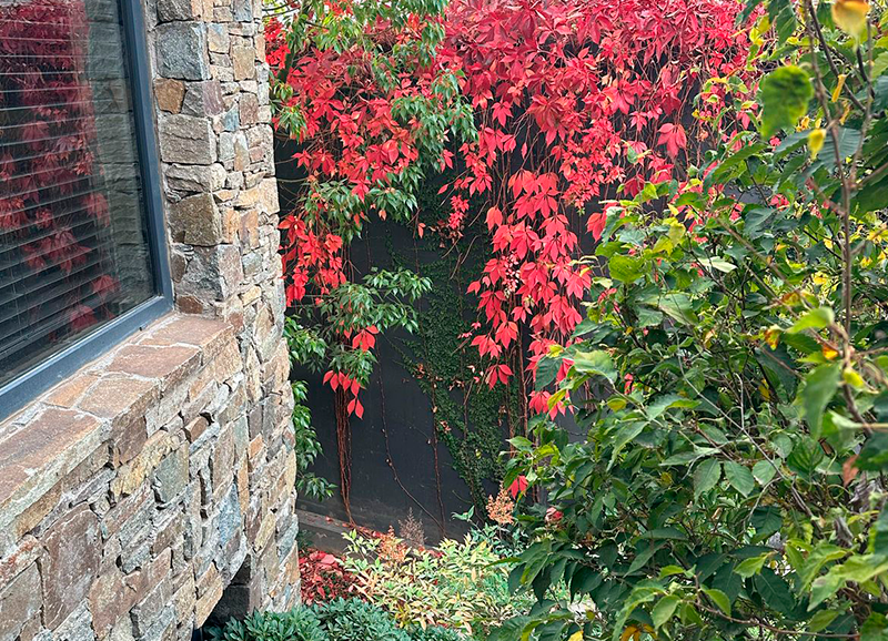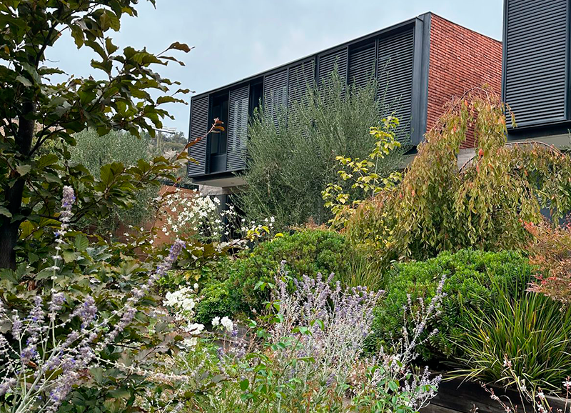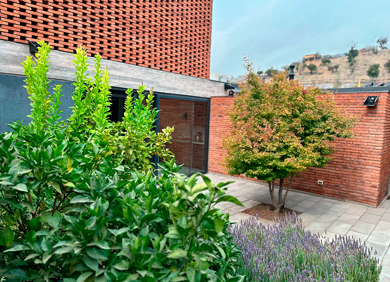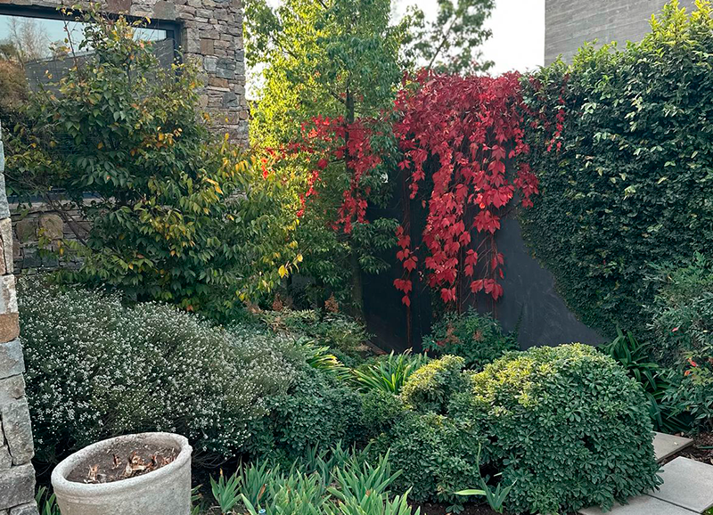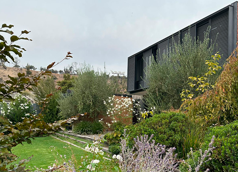 Este jardín fue un gran desafío, ya que era un terreno con muchos desniveles, rincones y áreas a trabajar. La materialidad en piedra de la casa nos entregó un marco perfecto para crear un jardín con distintos tipos de follajes y de tonalidades de verdes, también con muchos coloridos otoñales, y flores que van apareciendo en distintas estaciones del año. Todo esto nos dejó como resultado un jardín muy dinámico y entretenido, el que es usado y contemplado a lo largo de todo el año.
