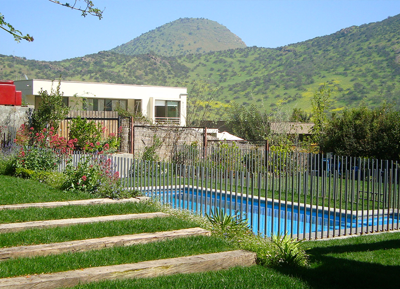 El terreno de esta casa presentaba el desafío de tener una pendiente muy marcada, la que se resolvió aterrazando el jardín en dos alturas, usando bajadas y jardineras don durmientes. En la zona de pendiente más baja se dejó el mínimo necesario de pasto al lado de la piscina y bordes de jardineras, y el resto se creó una circulación de maicillo y una isla con una gran Haya roja como protagonista. El nivel alto pegado a la casa se trabajó con gravillas y durmientes negros, y plantas que dividen la salida de las áreas comunes de la pieza principal.